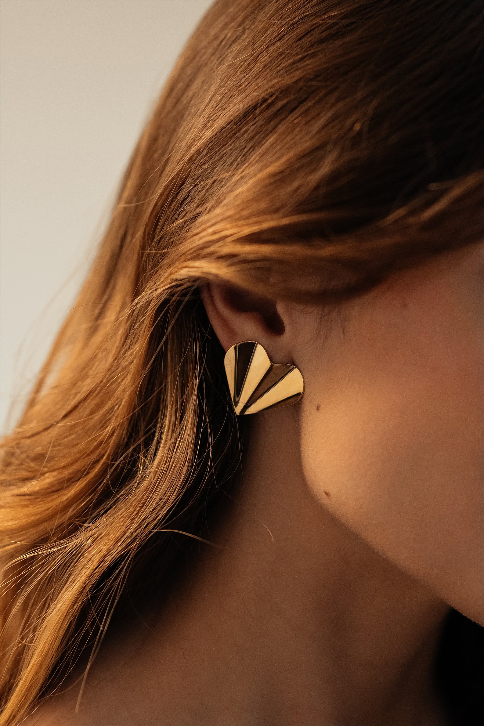Brinco em formato de coração, plissado, semi joia no banho de Ouro 18 k. Peça delicada, medindo em torno de 2 cm.
